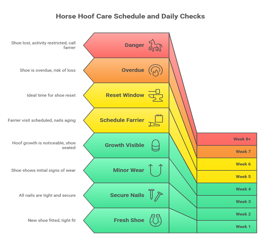 - Hold your farrier schedule at 5 to 8 weeks, and track it. Don’t rely on memory. Set a recurring calendar reminder for your horse’s reset cycle. Stretching even two weeks beyond the recommended interval allows enough overgrowth to shift the hoof angle and stress the shoe to hoof bond. More shoes are lost in weeks seven and eight than at any other point in the cycle.