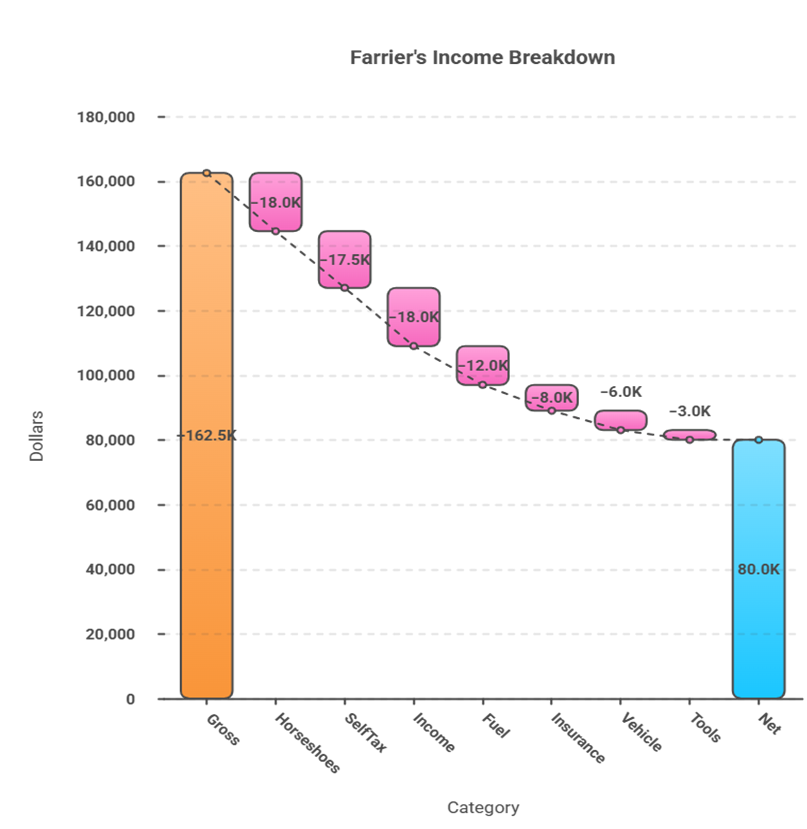 This is a strong year scenario for an experienced farrier with a full schedule. Early career farriers typically net $30,000 to $50,000 while building their client base. Farriers in high cost metro areas or specialising in racetrack and performance work can net significantly more. Farriers in rural areas with lower per horse rates may net less.
