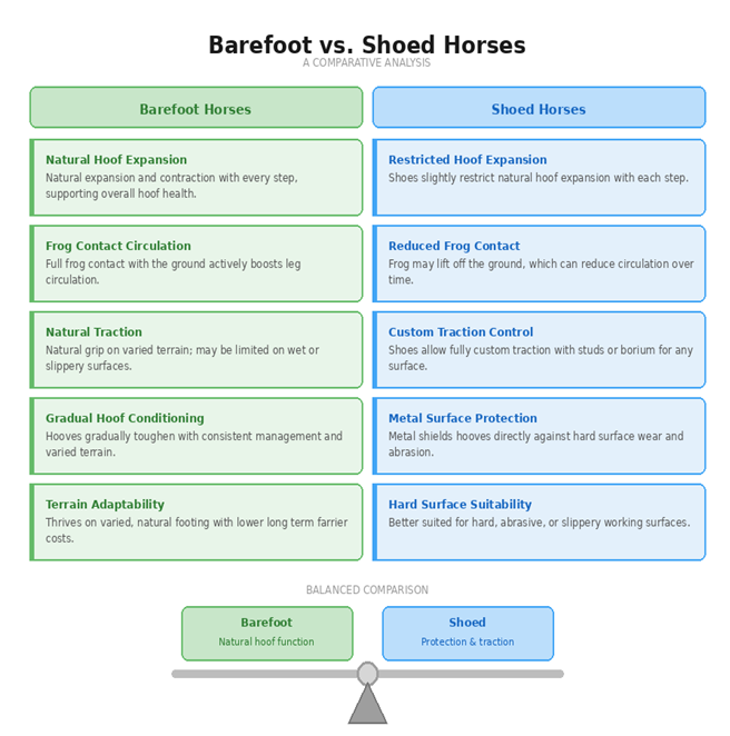 Here is the key thing: when reading this comparison, remember that individual horse variation, management quality, and environmental conditions all influence outcomes just as much as the choice of shoeing itself. A well managed barefoot horse on appropriate terrain will consistently do better than a poorly maintained shod horse worked on inappropriate surfaces with irregular farrier care across the year.